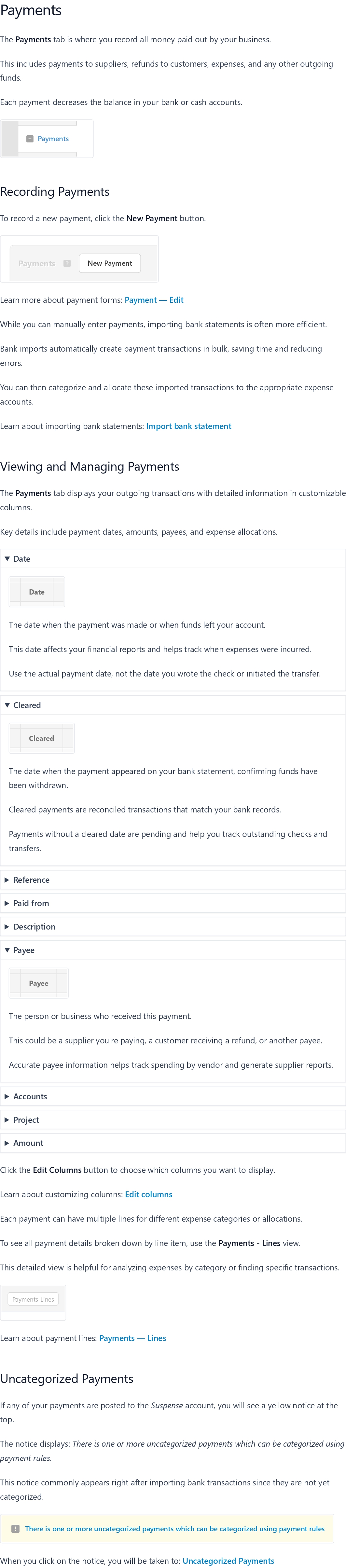 Η καρτέλα Payments είναι ο χώρος όπου καταγράφετε όλα τα χρήματα που πληρώνει η επιχείρησή σας. Αυτό περιλαμβάνει πληρωμές σε προμηθευτές, επιστροφές χρημάτων σε πελάτες, έξοδα και οποιαδήποτε άλλη εκροή κεφαλαίων. Κάθε πληρωμή μειώνει το υπόλοιπο στους τραπεζικούς ή ταμειακούς λογαριασμούς σας.